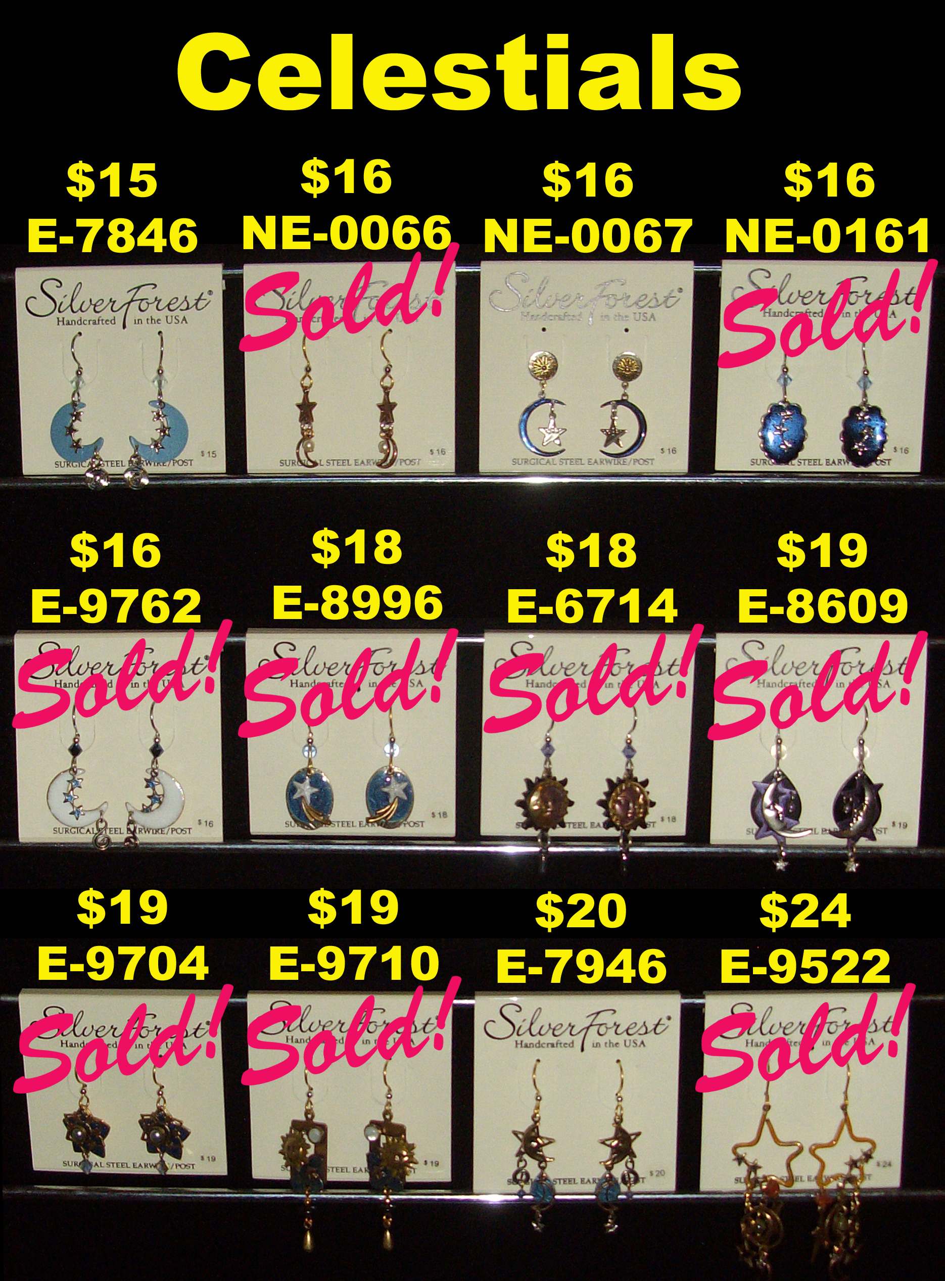 Above each pair of earrings you will see its price and a stock number which contains letters and numbers. In addition, for earrings which contain semi-precious stones, the specific type of stone will be identified above each pair of earrings.