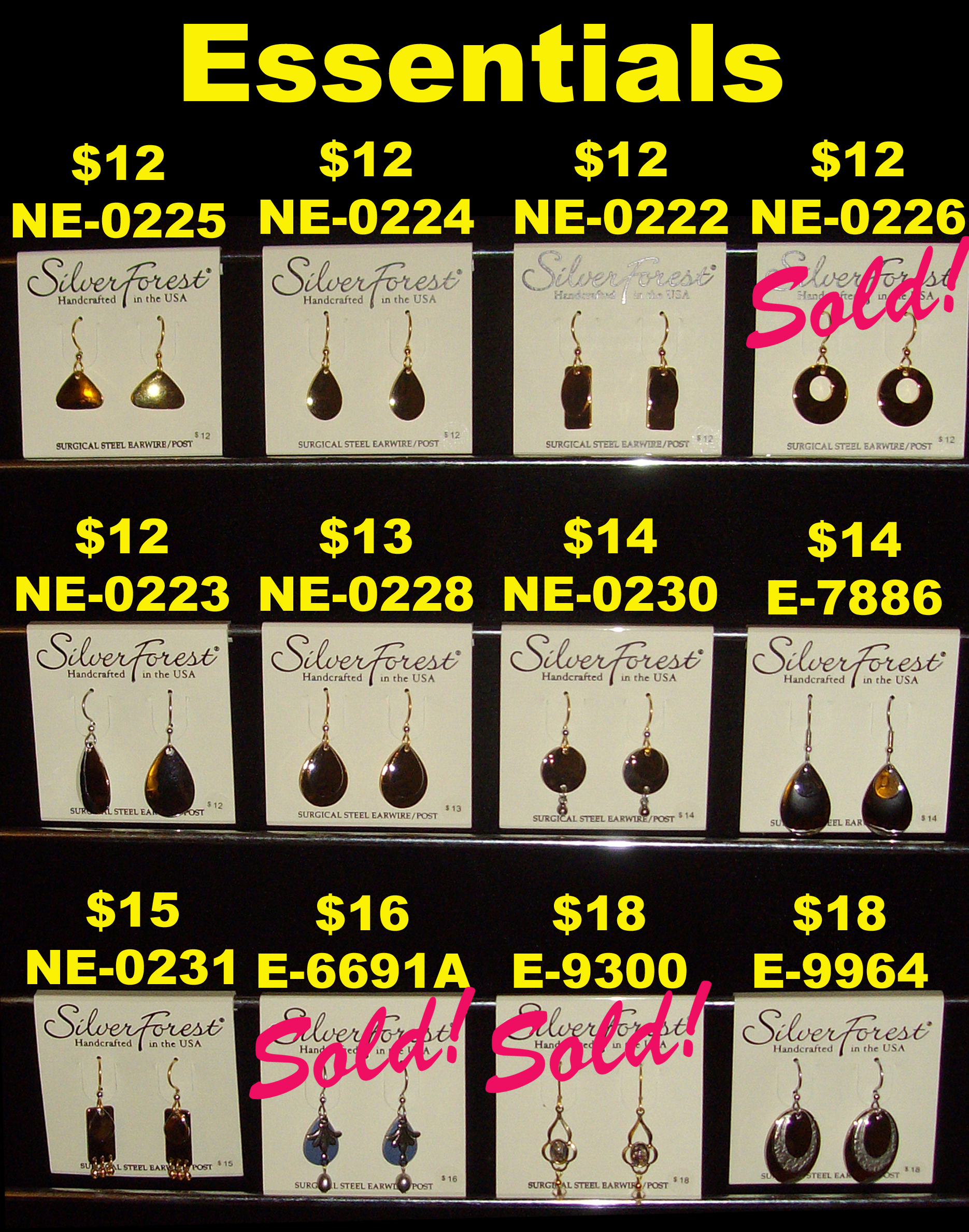 Every pair of Silver Forest earrings in our stock as of that date appears in these photos. We do not stock duplicate pairs, so if the pair is marked "sold" we no longer have it in stock. Almost all of these earrings are for people with pierced ears. However, we often have a few pairs in the "Clip-ons" category.