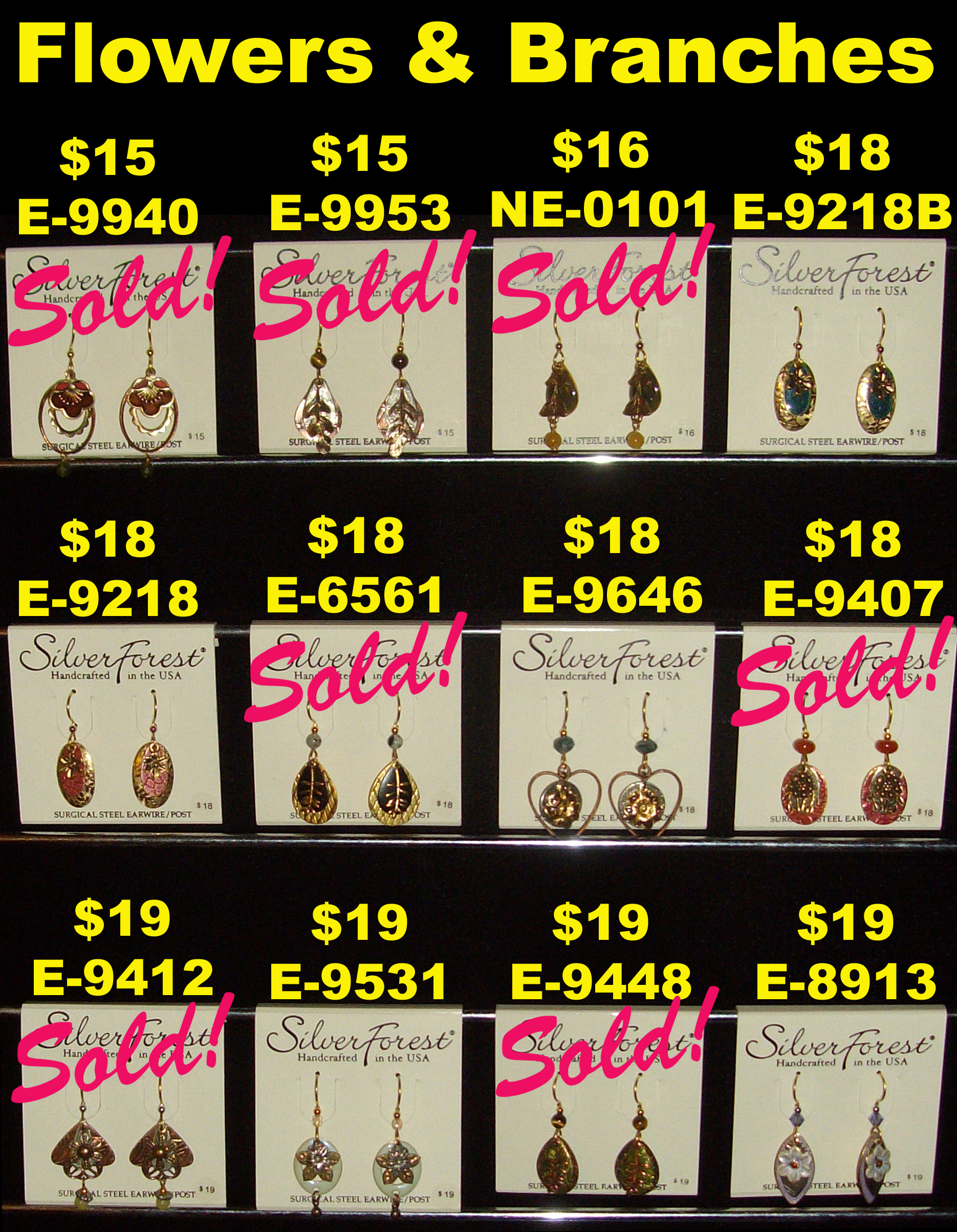 Every pair of Silver Forest earrings in our stock as of that date appears in these photos. We do not stock duplicate pairs, so if the pair is marked "sold" we no longer have it in stock. Almost all of these earrings are for people with pierced ears. However, we often have a few pairs in the "Clip-ons" category.