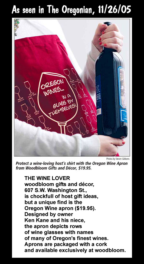 | Oregon Wine Shirt or Apron Oregon is a great wine producing state. Pinot noir is Oregon's signature wine style, but a wide variety of ... uh, varietals are made here. woodbloom® has designed a short-sleeve, silkscreened t-shirt which pays homage to several of these styles and the artisan vintners who create them ... and pokes a little fun at our friends to the south. The same graphic is also available in an adjustable, one-size-fits-all apron. The particulars ...